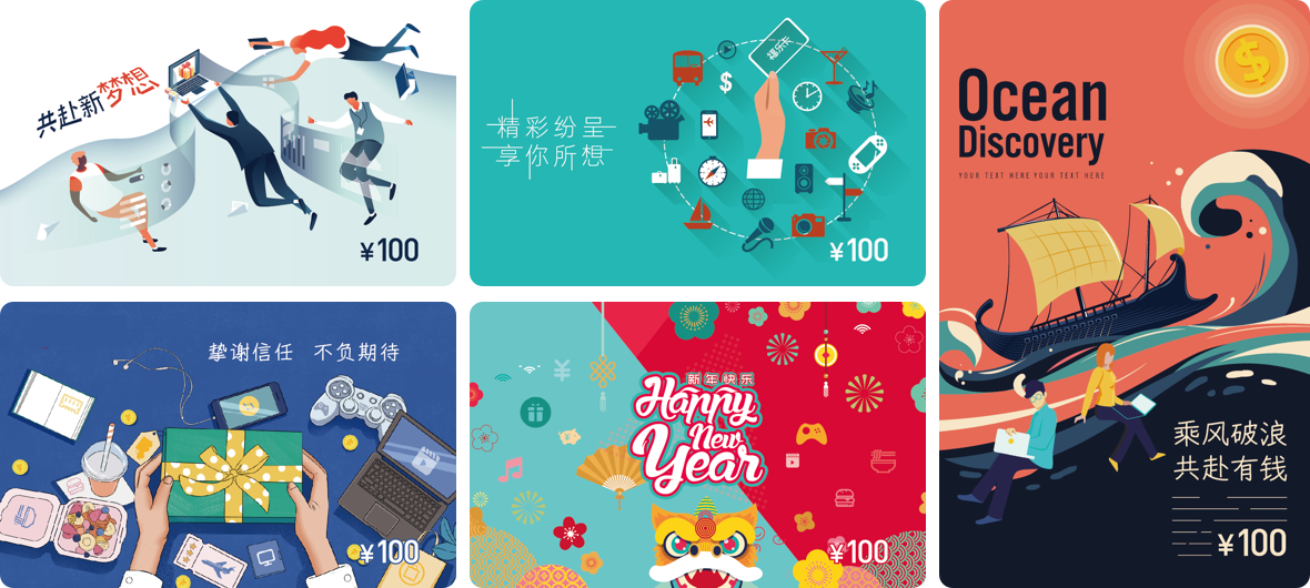 员工关怀、营销赠礼、节日礼品等场景均提供多种优质卡面设计选择,同时为客户提供卡面定制设计服务